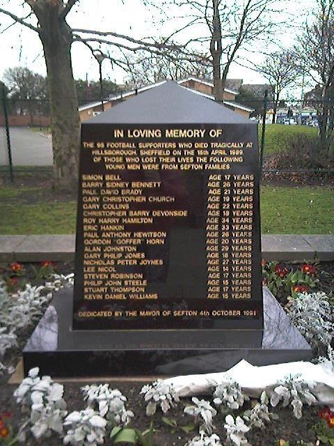 A memorial unveiled by Sheffield Wednesday FC in 1999, significantly it is well away from the Leppings Lane end by the main stand, off club premises and contains no reference to the fact the supporters died at Hillsborough.