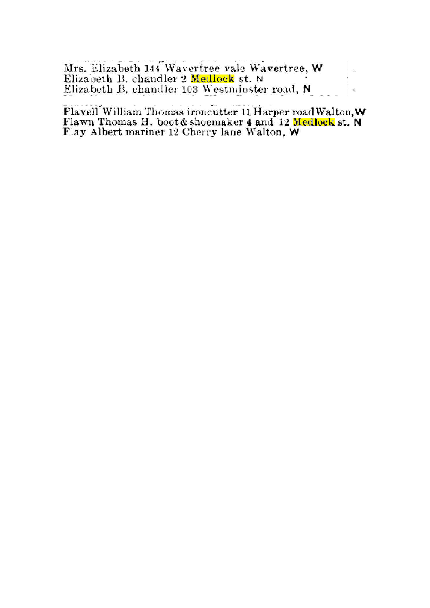 Elizabeth B. ['Elizabeth' is the surname, so could be male or female?] who is a chandler by trade lives at 2 Medlock Street, in 1900. Next door at number 4 Medlock Street was Thomas H. Flawn who was a boot & shoemaker.