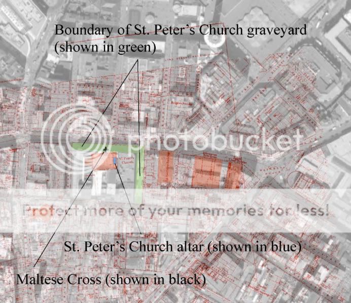 The Maltese cross location, in relation to St Peter's church altar. Hopefully this will clear things up a little. Descriptions are given below each image.