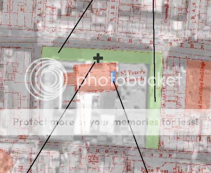 Answer to Q.2: The buildings follow the street line, not the church's line. When the church-plot was purchased, builders on neighbouring plots would not have wasted any time setting up their designs and commenced building [represented by the thick black dashed line on image 2 & 3]. In setting out St Peter's, the architect, had decided to orientate the building about it's west/ east axis, as was the custom with most unrestricted sites.