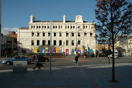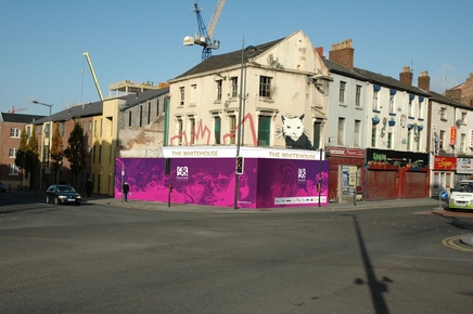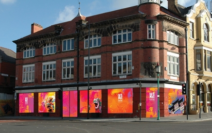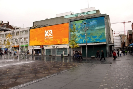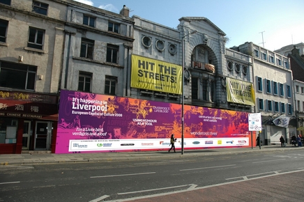 I was in the city in 2003 when St. George's Hall, while undergoing renovation, was "wrapped" with the graphic of John Lennon as the Mona Lisa and some prankster cut out Lennon's eye. I wrote a poem about it, "John Lennon's Eye". I suggest that this "wrapping" is a bit too transparent and obvious, although I suppose it serves the purpose of hiding something temporarily.