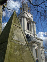 Hawksmoor's church - St. Anne, Limehouse, London built 1714-30 also has a pyramid in the graveyard. I'll have to get the inscription next visit?