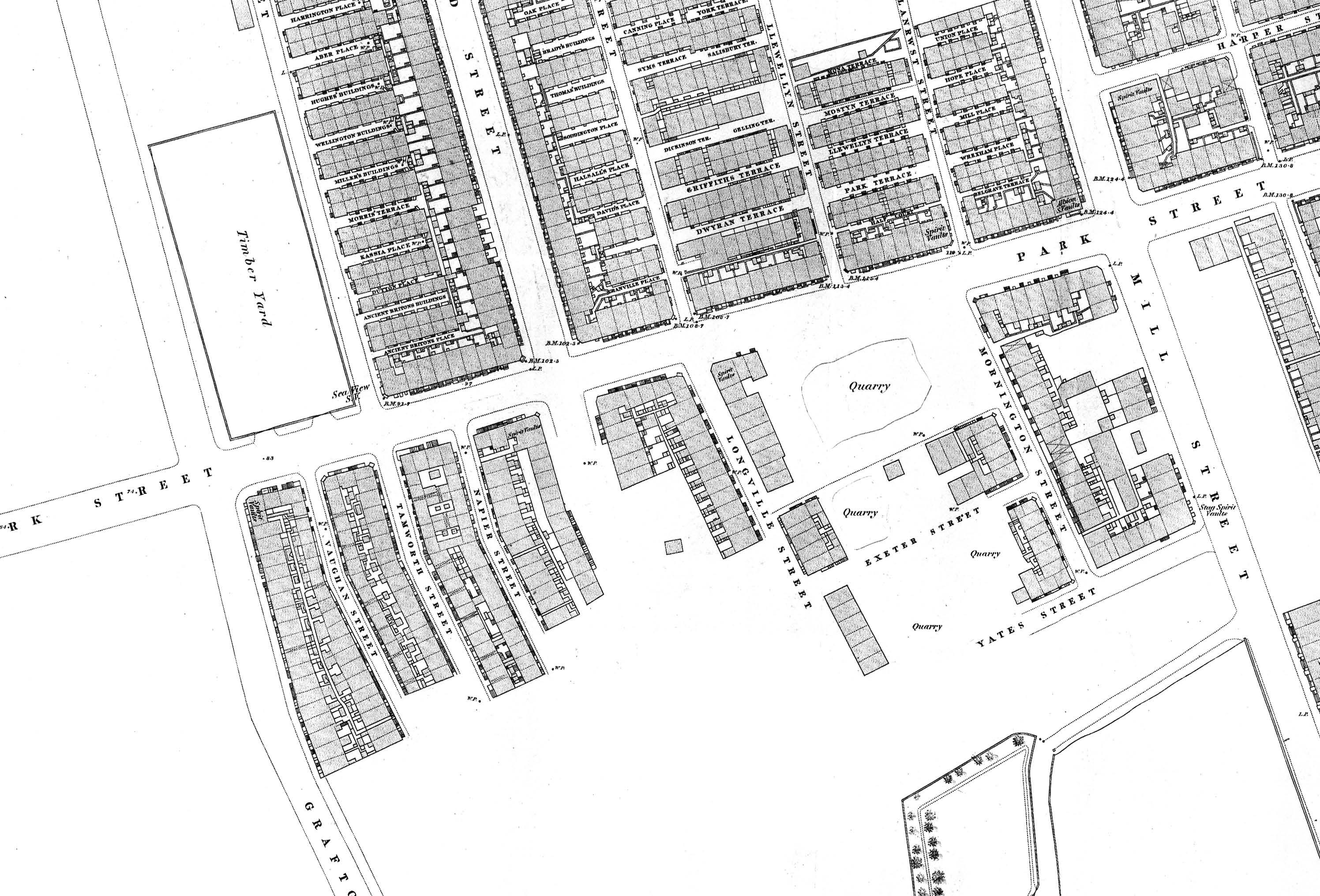 The Royal Southern Hospital can be seen in the distance left [on Hill Street] Mann Street is parallel to the Hospital and leads from Hill Street to the Brewery shown in the distance. Mann Street would be where the chimney is shown in the far right.